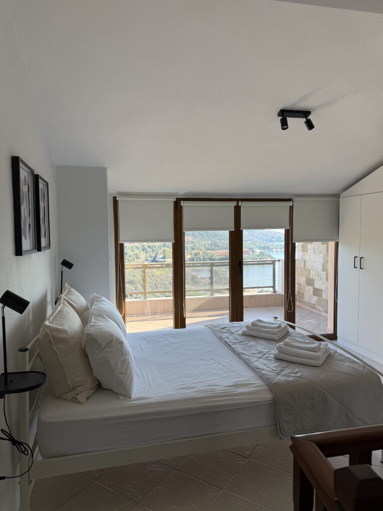The home features two spacious balconies with sea views, furnished with outdoor seating, perfect for relaxing or enjoying your meals.