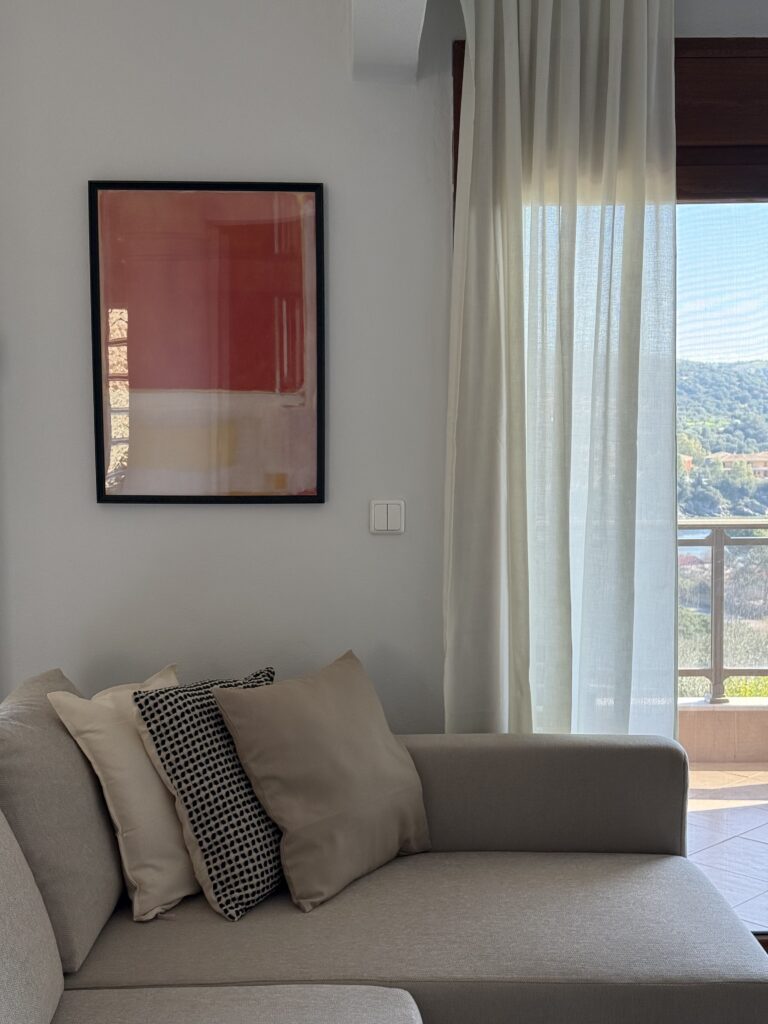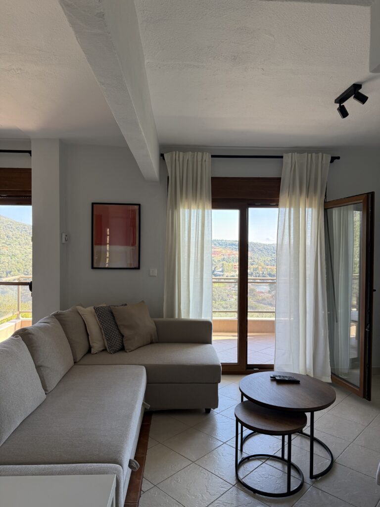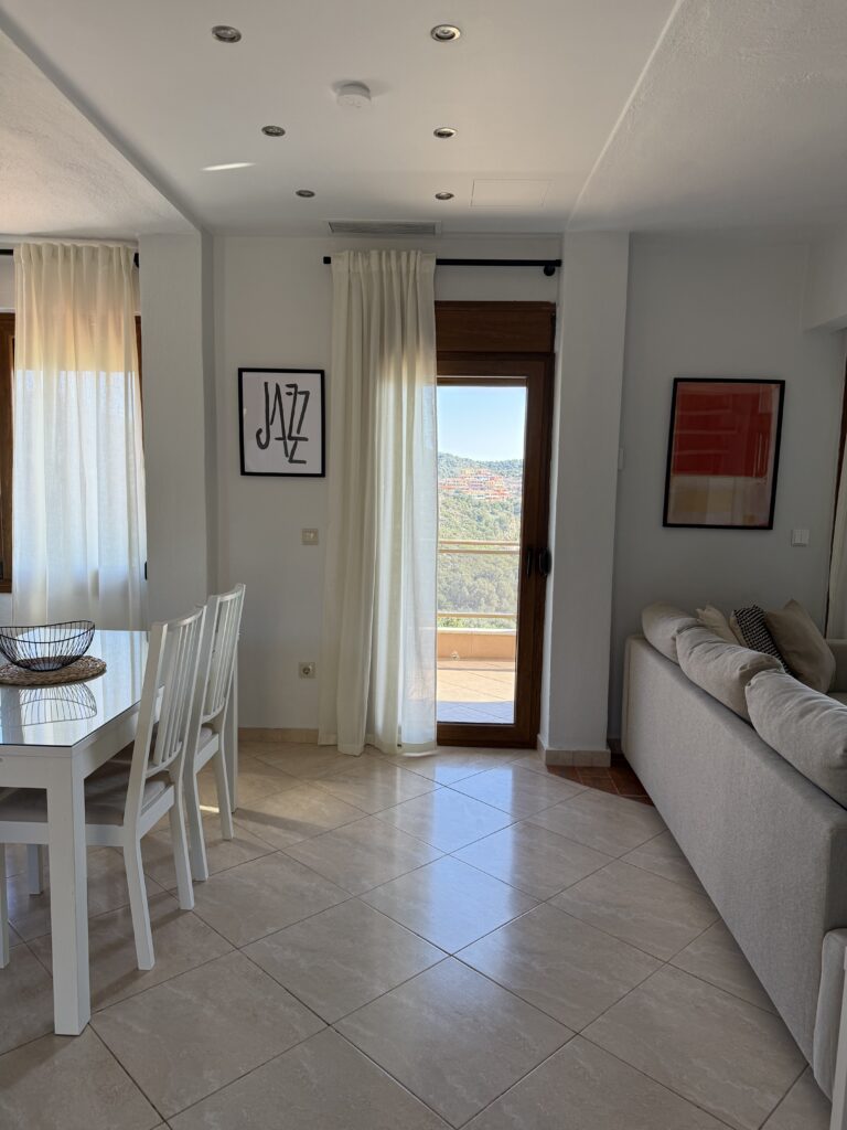 Bright and comfortable living room with a corner sofa bed, Smart TV, air conditioning, and direct access to the balcony with a beautiful view. The large balcony doors provide coolness and plenty of natural light. The space is open-plan with the dining area and comfortably covers everyday living needs.